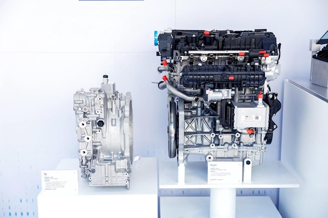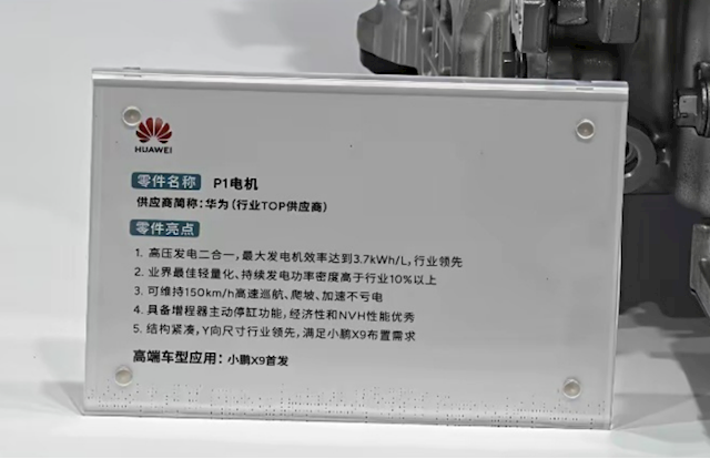 与此同时,小鹏还展示了华为自研的P1电机实物,高压发电二合一,最大发电机效率达到3.7kW/L,行业领先。
