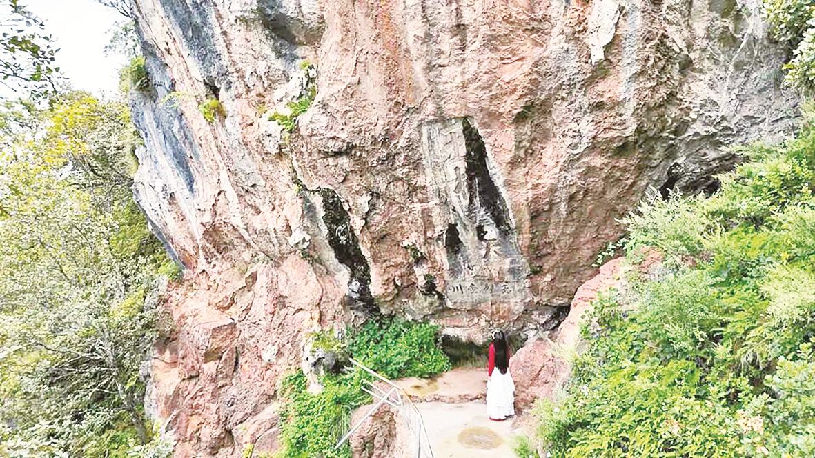 游客在欣赏“玉柱擎天”摩崖石刻。 (通讯员 王晓明 摄)